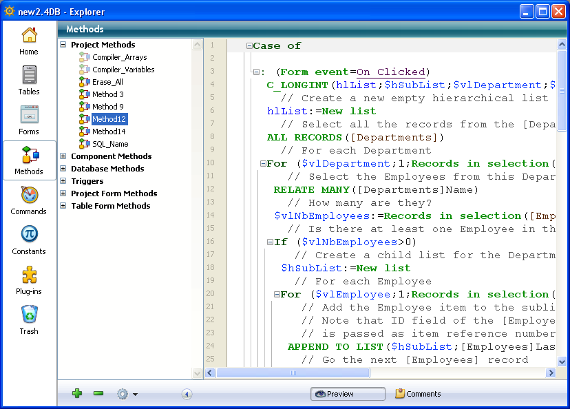 Database Methods: You cannot create new database methods. Instead, you can add code to an existing blank database methods. To do so, expand the Database Methods item then double-click the database method to be modified or choose Edit Method... from the context menu or from the options menu.