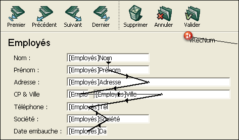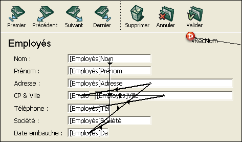 Par défaut, tous les champs sont inclus dans l’ordre de saisie. Si vous souhaitez exclure un champ de l’ordre de saisie — tout en conservant sa propriété “Saisissable”, il vous suffit de désélectionner l’attribut Tabulable pour ce champ. Pour plus d’informations, reportez-vous au paragraphe "Tabulable” dans la section Contrôles et aides à la saisie.