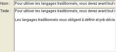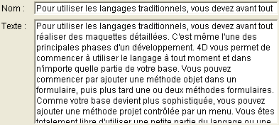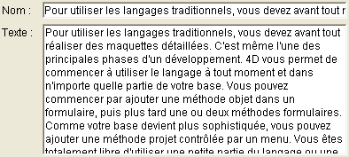 4D n’effectue aucun retour à la ligne automatique et le dernier mot affichable est éventuellement tronqué. Dans les zones de type texte, les retours chariot sont pris en charge :