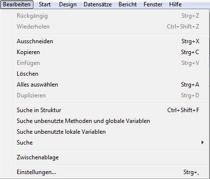 Es gibt zwei Suchbefehle, um Variablen und Methoden zu finden, die in Ihrem Code nicht verwendet werden. Sie können diese dann entfernen, um Speicherplatz wieder freizugeben. Diese Befehle liegen im Designmodus im Menü Bearbeiten: