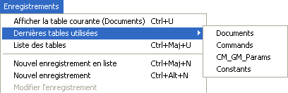 Choisissez une table dans la liste du sous-menu Dernières tables utilisées du menu Enregistrements.