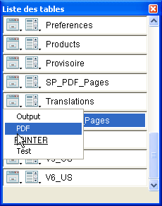 Chaque nom de table dans la fenêtre est précédé de deux icônes symbolisant les formulaires entrée et sortie. L’icône de gauche liste les formulaires Entrée. L’icône de droite liste les formulaires Sortie.