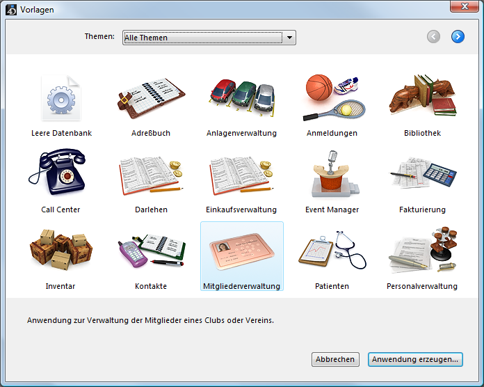 Sie können eine Datenbank über eine Vorlage mit bereits fertigen Tabellen, Feldern, etc. erstellen, die Sie rasch an Ihre eigenen Bedürfnisse anpassen können. Sie können auch eine leere Datenbank erstellen oder aus einer zuvor exportierten Strukturdefinition.