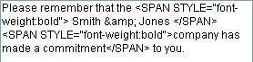 Puede constatar que el texto insertado se encapsuló dentro de un par de etiquetas de estilo adicionales. Estas etiquetas corresponden al estilo de los caracteres antes de la inserción. Este mecanismo permite garantizar una visualización correcta de los campos multiestilos en todos los casos.
