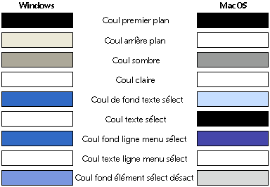 ATTENTION : Notez que, sous Windows, ces couleurs automatiques dépendent du système. Si vous modifiez vos couleurs système dans le Panneau de configuration "Affichage", les couleurs automatiques de 4D seront modifiées en conséquence. Utilisez les valeurs de couleurs automatiques pour assigner à des objets les couleurs système, et non pour leur assigner les mêmes couleurs que celles définies dans l'exemple ci-dessus.