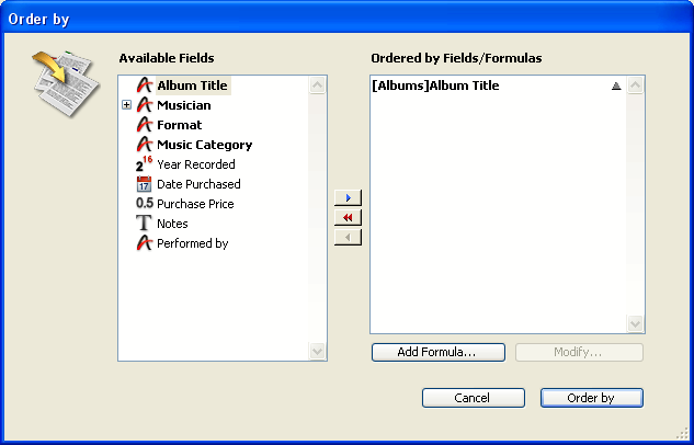 ORDER BY([Contatos];[Contatos]Sobrenome;>;[Contatos]Nome;>)Em um formulário de saída mostrado em modo Aplicação, você lhe permite aos usuários ordenar uma coluna em ordem crescente simplesmente clicando no cabeçalho da coluna. Se o usuário mantém pressionada a tecla Shift enquanto clica em outros cabeçalhos de colunas, a ordenação é realizada em vários níveis: