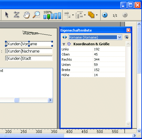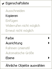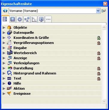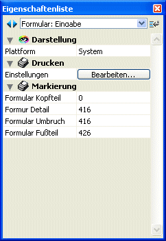 Der Benutzer kann die Eigenschaften von Objekten im Formular über eine vereinfachte Eigenschaftenliste ansehen und bearbeiten. Die Liste erscheint, wenn Sie auf das Objekt doppelklicken oder im Kontextmenü (rechte Maustaste) den Eintrag Eigenschaftenliste wählen.