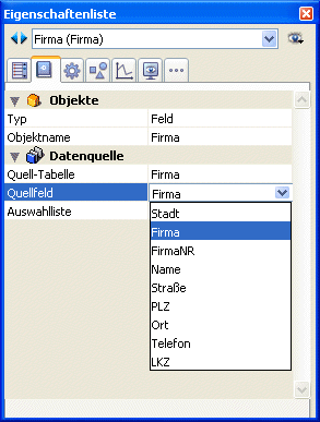 Um eine Variable in ein Datenfeld oder ein Datenfeld in eine Variable umzuwandeln, wählen Sie das Objekt und dann in der Eigenschaftenliste unter der Gruppe Objekte in der Zeile Typ Variable oder Feld. Die Liste wird nun neu aufgebaut, um die Eigenschaften des neuen Objekttyps anzuzeigen. Objektname, Objektmethode und seine Eigenschaften (eingebbar, Größe, Farbe, etc.) bleiben erhalten.