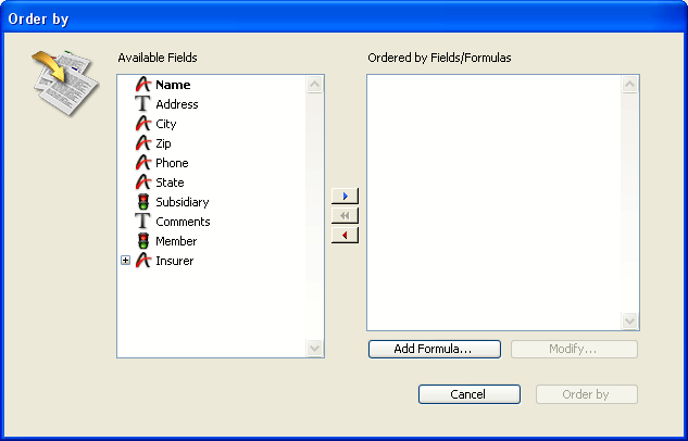 - フィールドリスト: このエリアには、カレントテーブルのフィールドが階層リストで表示されます。インデックスフィールドは太字で示されます。サブテーブルやリレートテーブルのフィールドに基づく並び替えも行えます (リレートが自動である場合) 。サブテーブルやリレートテーブルのフィールドを使用するには、プラス (+) 記号 (Windows) 、または矢印 (Macintosh) をクリックして外部キーフィールドを展開し、リレートしているフィールドを表示します。