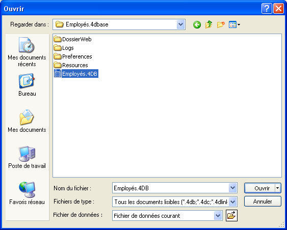 Sous Windows, vous devez sélectionner le fichier de structure de la base (suffixé .4DB ou .4DC).