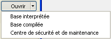 Ouvrir : le menu associé à ce bouton permet de définir le mode d’ouverture de la base. Il propose les options Base interprétée et/ou Base compilée, ainsi que Centre de sécurité et de maintenance :