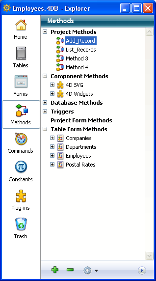 The Explorer is a window in the Design environment that gives you convenient access to tables, forms, methods, built-in 4D commands, constants and plug-ins. It also provides information about these items. You can display the Explorer at any time by choosing one of the pages in the Design > Explorer sub-menu or by clicking on the Explorer button in the toolbar.