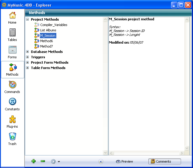 4D allows you to assign comments to the following database objects: folders, tables, fields, forms and methods (database methods, project methods, triggers and form methods) of your database. Displaying and modifying comments are carried out using the Explorer (the preview area must be expanded).