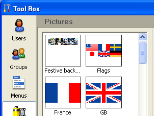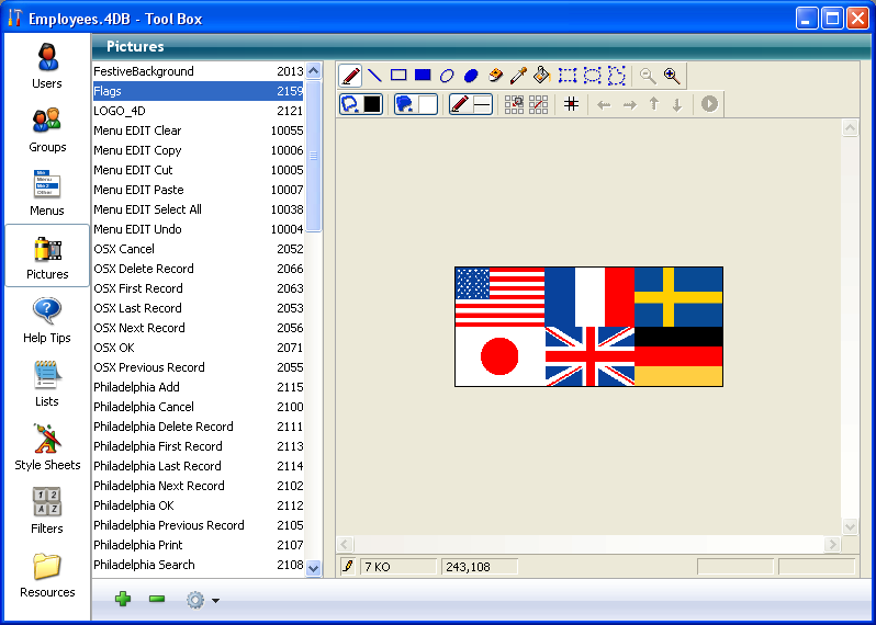 Click on the “Tool Box” button of the 4D tool bar then click on the “Pictures” button.