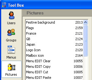 The Picture Library is included in the tool box of 4D. To display the Picture Library: