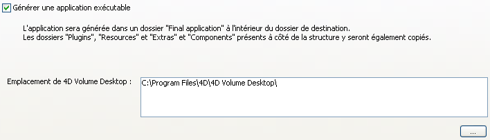 Une fois le dossier sélectionné, son chemin d’accès complet est affiché et, s’il contient effectivement 4D Volume Desktop, l’option de génération d’application exécutable est activée :