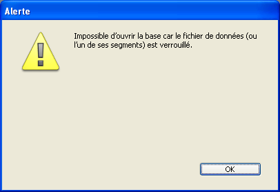 Autoriser l’ouverture du fichier de données en lecture seule : cette option permet de paramétrer le fonctionnement de l’application en cas d’ouverture d’un fichier de données verrouillé au niveau du système d’exploitation. 4D intègre un dispositif permettant d’empêcher automatiquement l’ouverture d’une base lorsque son fichier de données ou l’un de ses segments est verrouillé. Dans ce cas, lorsque la détection est activée, 4D affiche un message d’alerte et la base quitte : Lorsque l’option n’est pas cochée, il n’est pas possible d’ouvrir la base avec un fichier de données verrouillé (fonctionnement par défaut pour les bases 4D).