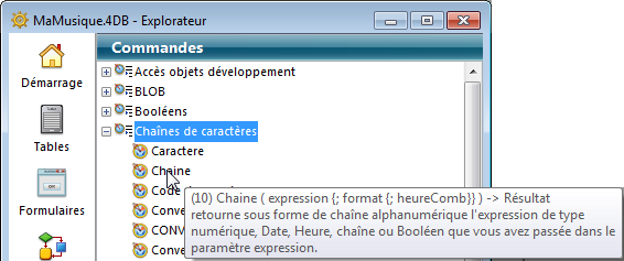 La zone de liste de l’Explorateur affiche également le numéro et la syntaxe des commandes sous forme d’infobulles :