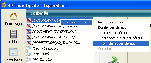 Les objets placés dans la corbeille n’apparaissent plus dans les éditeurs ou les menus de 4D, ils ne peuvent plus être modifiés, utilisés, déplacés, etc. D’autres objets similaires peuvent être créés avec le même nom. Les objets placés dans la corbeille peuvent cependant toujours être récupérés tant que la corbeille n’est pas vidée.