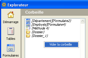 La page Corbeille de l’Explorateur rassemble tous les objets de type Dossier, Table, Formulaire ou Méthode projet ayant été supprimés dans la base.