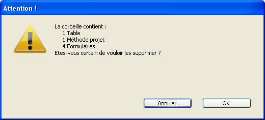 Par défaut, les objets supprimés restent dans la corbeille tant qu’elle n’est pas vidée. Vous pouvez à tout moment décider de vider la corbeille, par exemple avant un compactage, dans le but de réduire la taille du fichier de structure. Tous les objets présents dans la corbeille sont alors définitivement supprimés de la base.