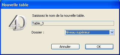 Vous pouvez placer directement un nouvel objet dans un dossier au moment de sa création. Le menu “Dossier”, situé dans les boîtes de dialogue de création de tables, de formulaires et de méthodes projet, permet de désigner le dossier dans lequel l’objet doit être créé. Par défaut, les objets sont créés au premier niveau (Niveau supérieur) ou dans le dernier dossier sélectionné dans l’Explorateur (le cas échéant). Le menu de sélection de dossier est par exemple présent dans la boîte de dialogue de création de table suivante :