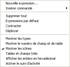 Vous pouvez ajouter une Nouvelle expression ou une Commande du langage de 4D, ou effectuer des opérations globales : Supprimer tout, réafficher toutes les Expressions par défaut, tout Contracter ou tout Déployer.