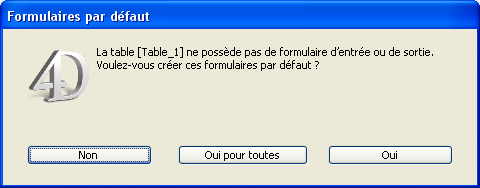 Ce menu définit le fonctionnement de 4D lorsque vous créez une table dans l’éditeur de structure puis ouvrez par exemple la fenêtre d’affichage des enregistrements. Par défaut, 4D vous signale qu’aucun formulaire ne lui est associé et vous propose de créer un formulaire entrée et un formulaire sortie :