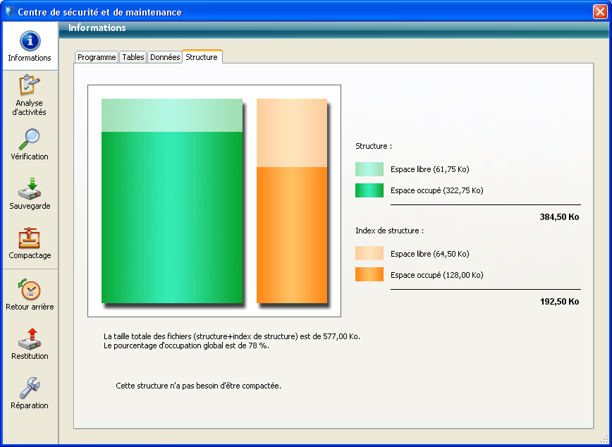 Les pages Données et Structure fournissent des informations sur le remplissage et l’occupation des fichiers de données et de structure de la base.