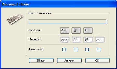 Pour modifier le raccourci, tapez sur votre clavier la nouvelle combinaison à employer et cliquez sur le bouton OK. Si vous souhaitez qu’il n’y ait pas de raccourci clavier associé à une action, cliquez sur le bouton Effacer.