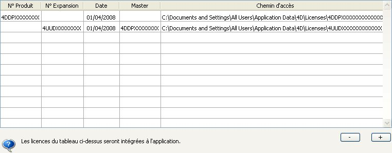 Pour ajouter ou supprimer des licences, utilisez les boutons [+] et [-] situés en bas de la fenêtre.