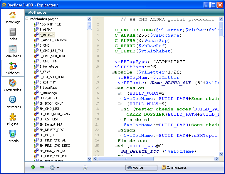 La page Méthodes affiche les listes des méthodes projet, méthodes base, méthodes formulaires table, méthodes formulaires projet et triggers de la base de données. Les types de méthodes sont groupés par catégories.