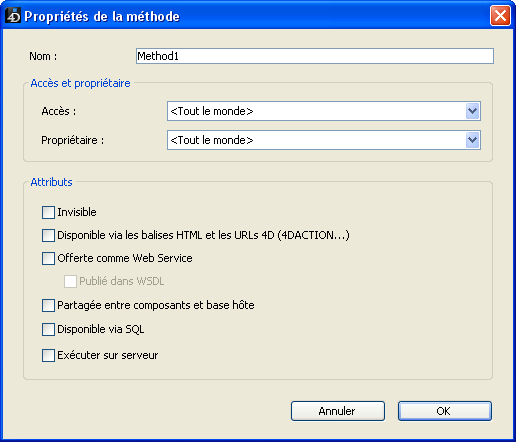 La boîte de dialogue “Propriétés de la méthode” apparaît. Elle vous permet de modifier le nom ainsi que d’autres propriétés de la méthode.