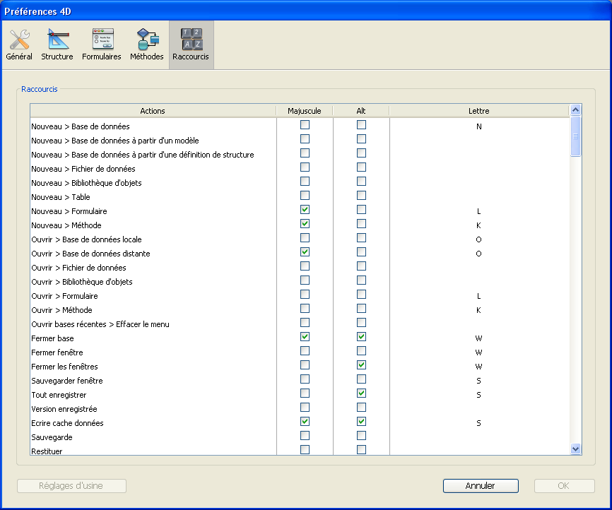 La liste des raccourcis est basée sur le fichier 4DShortcutsvXX.xml placé dans le sous-dossier 4D Extensions (4D v12) ou Resources (4D v13). Si vous personnalisez cette liste dans la boîte de dialogue, ce fichier est dupliqué dans le dossier de Préférences utilisateur et est utilisé à la place du fichier standard. Ainsi, à chaque mise à jour de 4D vous conservez vos préférences de raccourcis clavier.