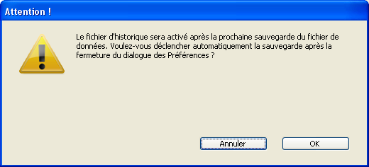 L’activation d’un nouveau fichier d’historique nécessite que les données de la base soient auparavant sauvegardées. Lorsque vous cochez cette option, au moment où vous validez la fenêtre des Propriétés de la base, une boîte de dialogue d’alerte vous informe qu’une sauvegarde est nécessaire :