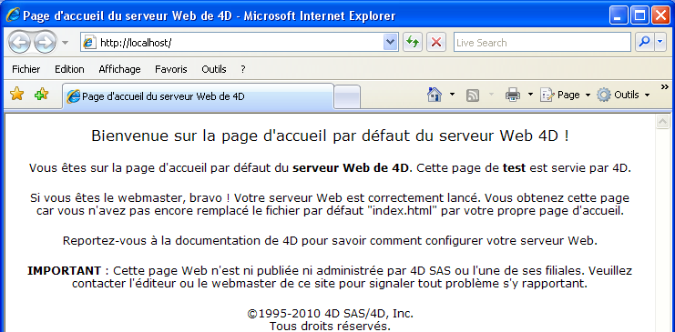 Par défaut, lors du premier démarrage du serveur Web, 4D crée une page d’accueil nommée “index.html” et la place dans le dossier racine HTML. Si vous ne modifiez pas ce paramétrage, tout navigateur se connectant au serveur Web obtient la page suivante :