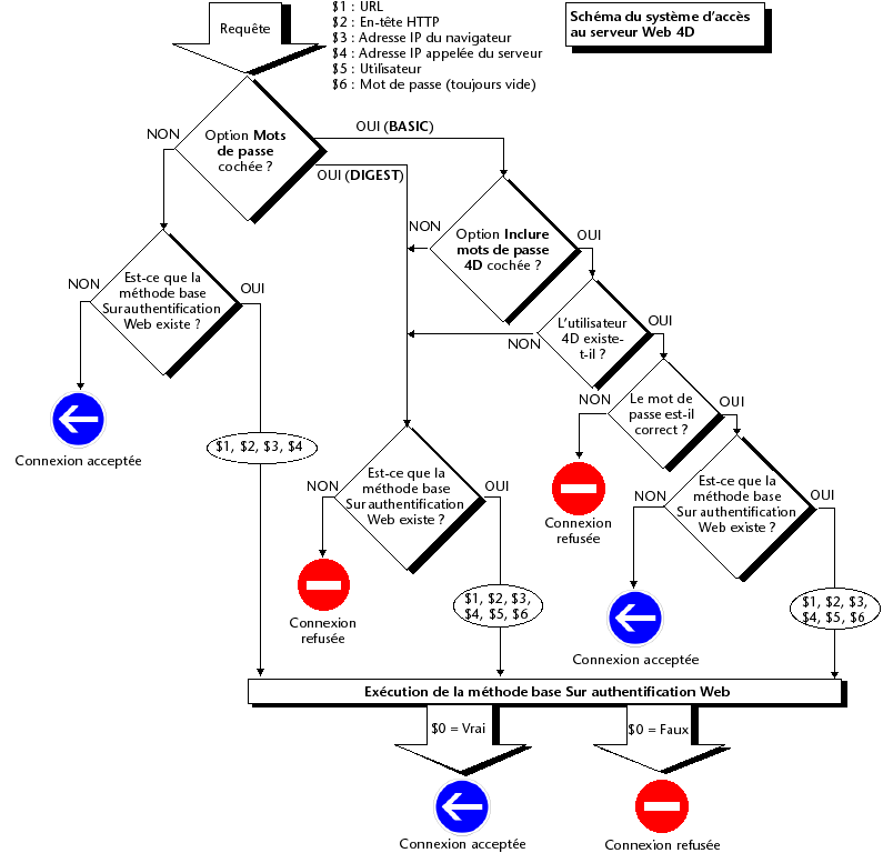 Le fonctionnement du système d’accès au serveur Web 4D est résumé dans le schéma suivant :