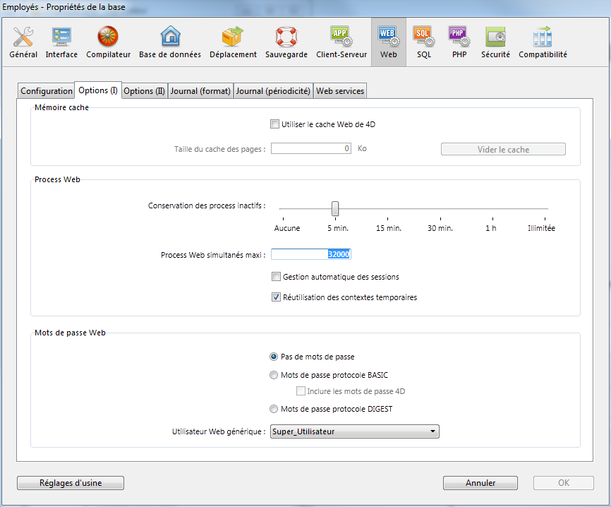 Le choix du mode d'authentification s’effectue dans la page Web/Options (I) de la boîte de dialogue des Propriétés de la base :