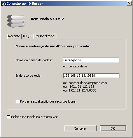 Nota: este parâmetro não é considerado nas aplicações cliente-servidor personalizadas. Em teoria, a aplicação cliente se conecta diretamente à aplicação servidor, sem passar pela caixa de diálogo de conexão. Entretanto, em caso de erro, esta caixa de diálogo aparecerá, neste caso, o nome da publicação da aplicação servidor é o nome do banco compilado.