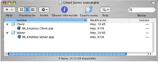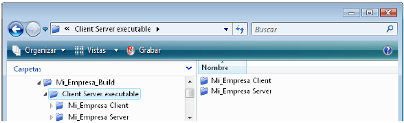 La carpeta Nombre Aplicación Client contiene la parte cliente de la aplicación correspondiente a la plataforma de ejecución del generador de la aplicación. Esta carpeta debe instalarse en cada maquina cliente. La carpeta Nombre Aplicación Server contiene la parte servidor de la aplicación.