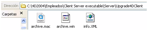 Cuando se genera una nueva versión de la aplicación cliente/servidor utilizando el generador de aplicaciones, la nueva parte cliente se copia como un archivo comprimido en la subcarpeta Upgrade4DClient de la carpeta NombreAplicación Server (bajo Mac OS, estas carpetas se incluyen en el paquete servidor). Si ha seguido el proceso para la generación de una aplicación cliente multiplataforma, un archivo de actualización está disponible para cada plataforma: