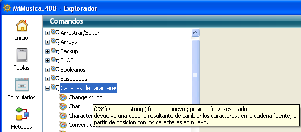La página Comandos muestra todas las rutinas integradas de 4D, agrupadas por temas. Esta lista es la misma que la que se muestra en el editor de métodos.