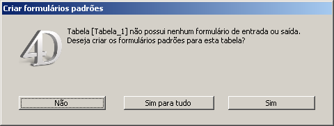 Este menu permite definir o funcionamento de 4D quando se cria uma tabela no editor de estrutura e logo abre, por exemplo, a janela de visualização de registros. Por padrão, 4D lhe indica que nenhum formulário foi criado para a nova tabela e lhe dá a opção de criar um formulário de entrada ou um formulário de saída automaticamente: