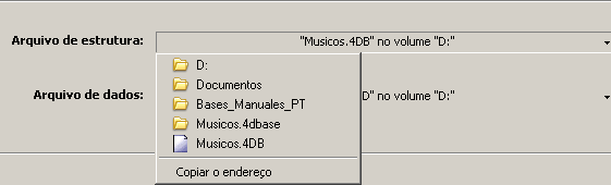 - Visualização e seleção de endereços de acesso: na página Programa, os endereços de acesso são exibidos em forma de menus pop-up que contém o endereço das pastas como são encontradas no disco rígido: