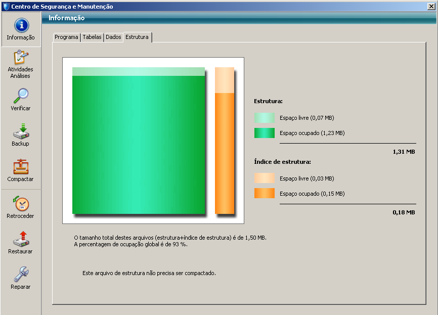 As páginas Dados e Estrutura oferecem informação sobre o espaço livre e o ocupado dos arquivos de dados e de estrutura do banco.