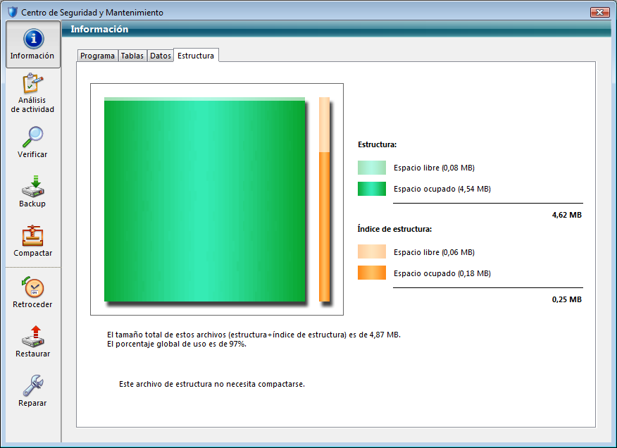 Las páginas Datos y Estructura ofrecen información sobre el espacio libre y el ocupado de los archivos de datos y de estructura de la base.