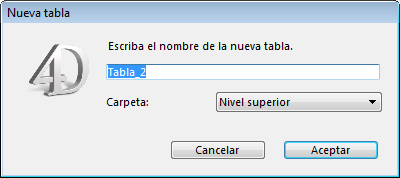 Puede poner directamente un nuevo objeto en una carpeta durante su creación. El menú "Carpeta", ubicado en las cajas de diálogo de creación de tablas, formularios y métodos proyecto, permite seleccionar la carpeta en la cual crear el objeto. Por defecto, los objetos se crean en el primer nivel (Nivel superior) o en la última carpeta seleccionada en el Explorador (si aplica). El menú de selección está por ejemplo presente en la caja de diálogo de creación de tablas como se muestra en la siguiente imagen: