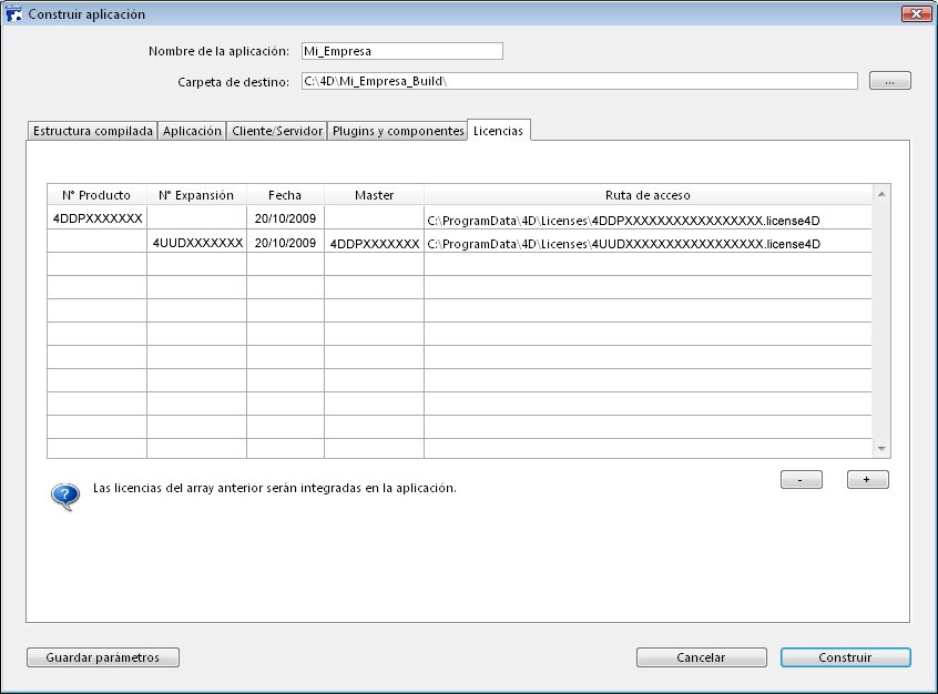 Debe designar los archivos que contienen su licencia Developer así como también sus licencias de despliegue. Estos archivos fueron generados o actualizados en el momento de la adquisición de la licencia 4D Developer Professional y de las licencias 4D Desktop Volume.
