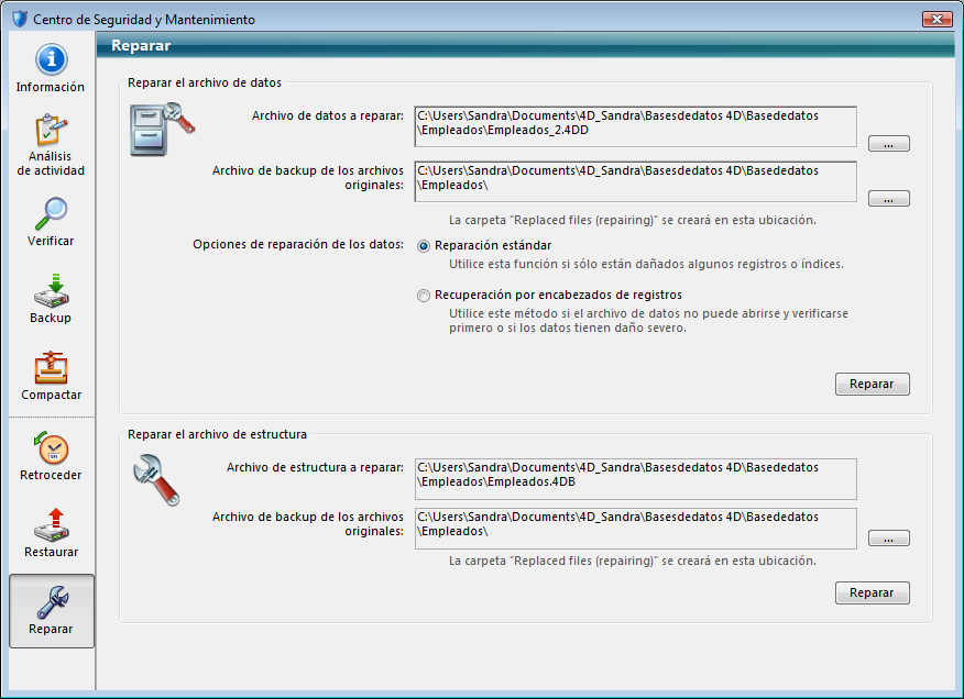 Esta página permite reparar el archivo de datos o el archivo de estructura cuando está dañado. Por lo general, sólo utilizará estas funciones por solicitud de 4D, cuando se detectan anomalías al abrir la base o después de una verificación (ver Página Verificar).