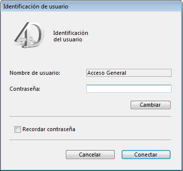 Nota: puede “forzar” la visualización de la caja de diálogo estándar de entrada de contraseñas cuando el modo “Usuario por defecto” esté activo, por ejemplo para conectarse como Administrador o Diseñador. Para hacerlo, presione la tecla Mayús mientras abre la base o se conecta a ella.